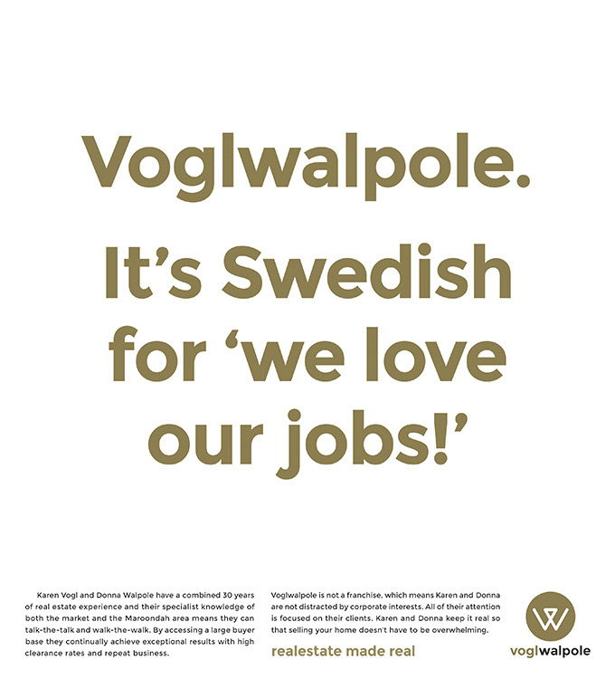 Visual identity and advertising campaign for a boutique real estate company. The name of the company, Voglwalpole, is comprised of the surnames of the company principals (Vogl and Walpole) so it was decided that a brand mark made from a close-knit V and W was apt.